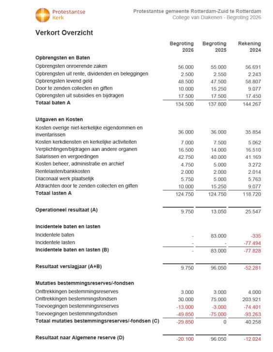 Tekorten worden gedekt vanuit opgebouwde reserves. Door de inzet van vele mensen is het mogelijk dat in alle wijkgemeenten tal van activiteiten plaatsvindt. Al dit werk wordt samengevat in cijfers. Iets wat in onze huidige maatschappij helaas een erg belangrijke plaats inneemt. In de Kerk is dat gelukkig anders. Daar draait het om de Liefde van onze Heiland voor ons. Wij hebben allemaal op onze plaats daarvan iets mogen doorgeven met als doel Hem te dienen die ons eerst heeft liefgehad. Bij ons draait het niet om cijfers maar om Hem. En dat laat zich onmogelijk vangen in cijfers. Dankbaar zijn we dat we bovenstaande activiteiten hebben mogen en kunnen doen.